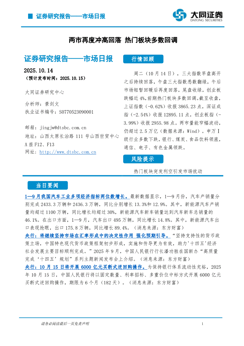大同证券-市场日报:两市再度冲高回落,热门板块多数回调-251014