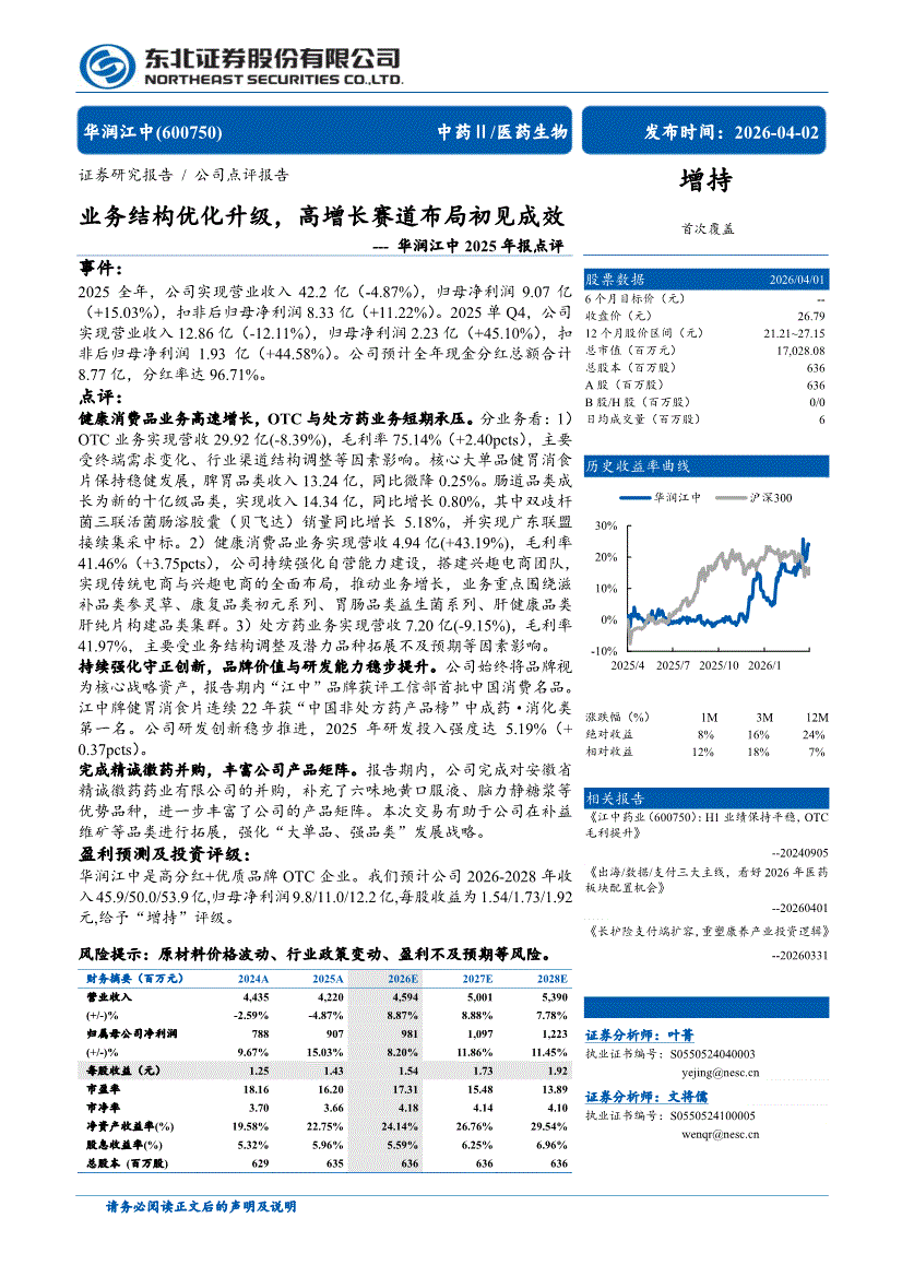 华润江中:东北证券-华润江中-600750-2025年报点评:业务结构优化升级,高增长赛道布局初见成效-260402