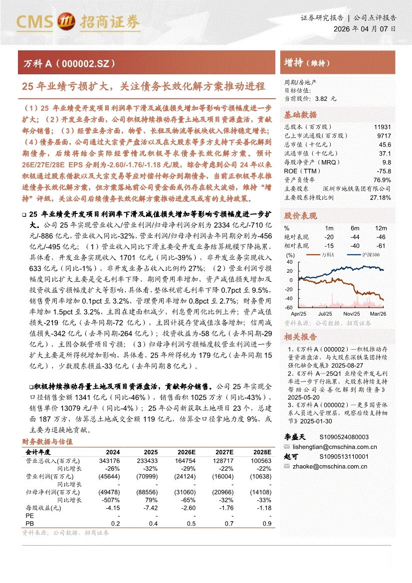 万科A:招商证券-万科A-000002-25年业绩亏损扩大,关注债务长效化解方案推动进程-260407