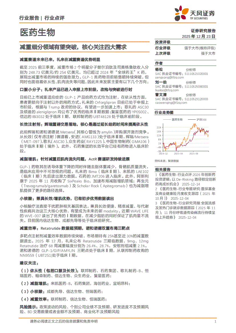 医药生物行业:天风证券-医药生物行业点评:减重细分领域有望突破,核心关注四大需求-251223