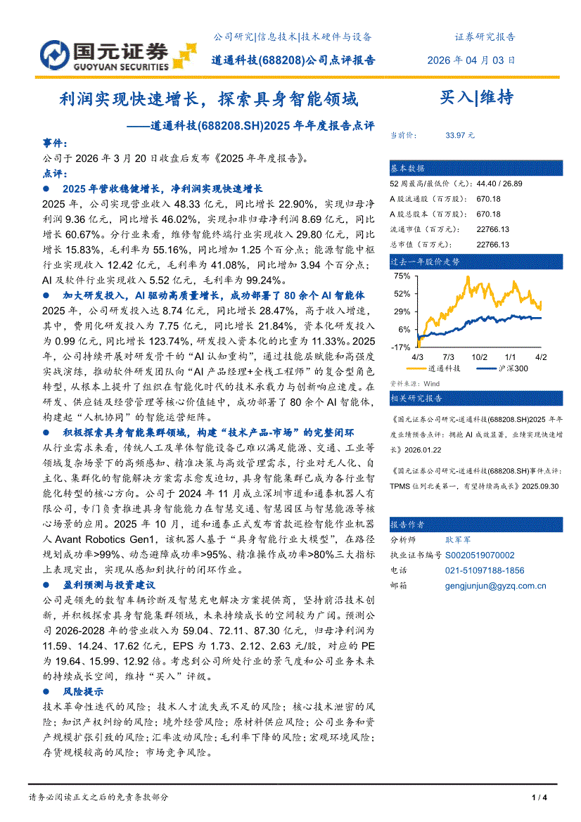 道通科技:国元证券-道通科技-688208-2025年年度报告点评:利润实现快速增长,探索具身智能领域-260403