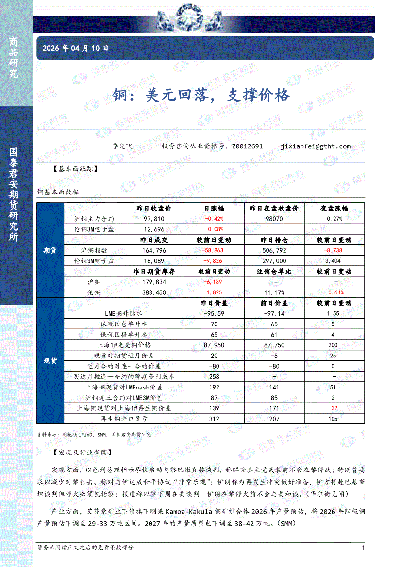 国泰君安期货-铜:美元回落,支撑价格-260410