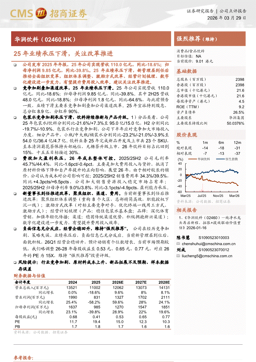 华润饮料:招商证券-华润饮料-2460.HK-25年业绩承压下滑,关注改革推进-260329