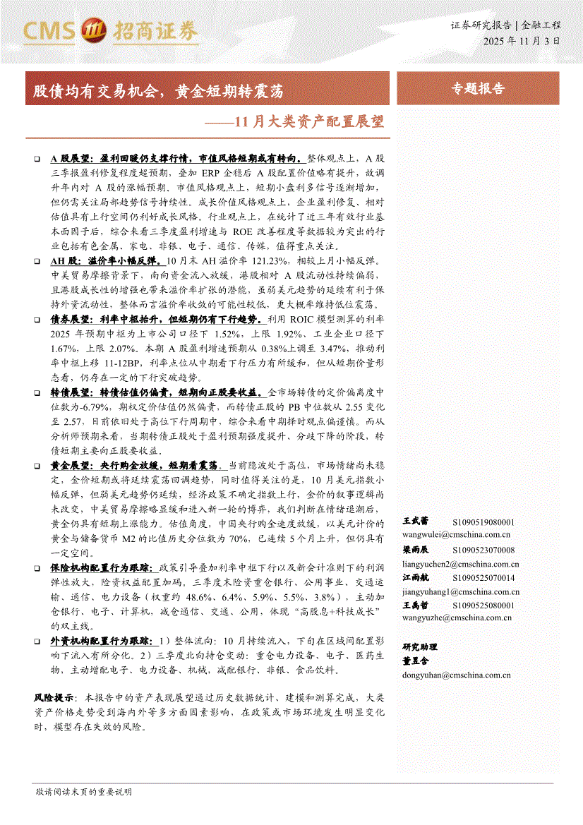 招商证券-11月大类资产配置展望:股债均有交易机会,黄金短期转震荡-251103