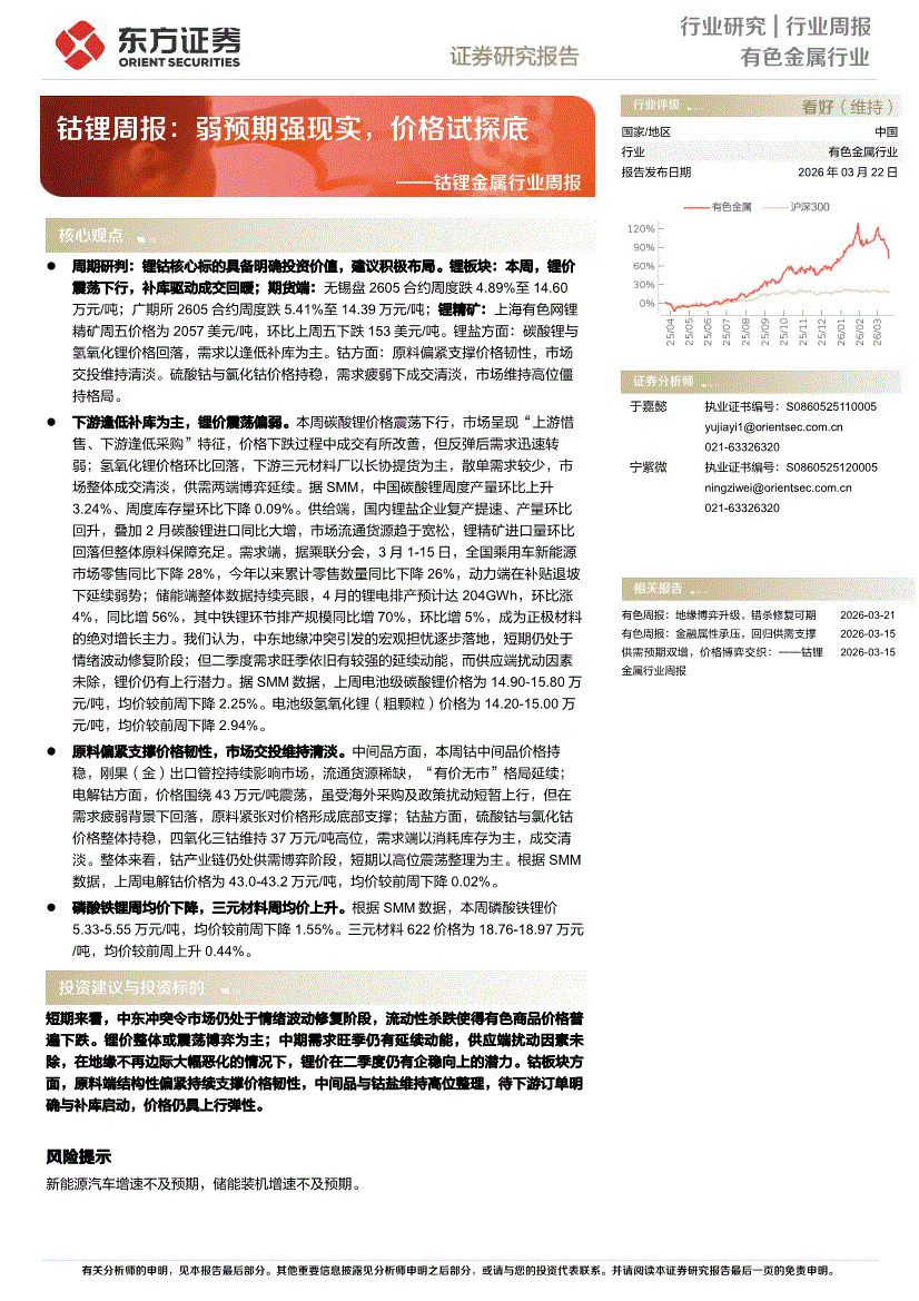 有色金属行业:东方证券-钴锂金属行业周报:钴锂周报,弱预期强现实,价格试探底-260322