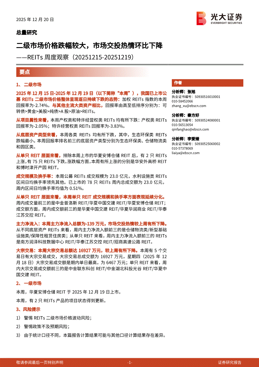 光大证券-REITs周度观察:二级市场价格跌幅较大,市场交投热情环比下降-251220
