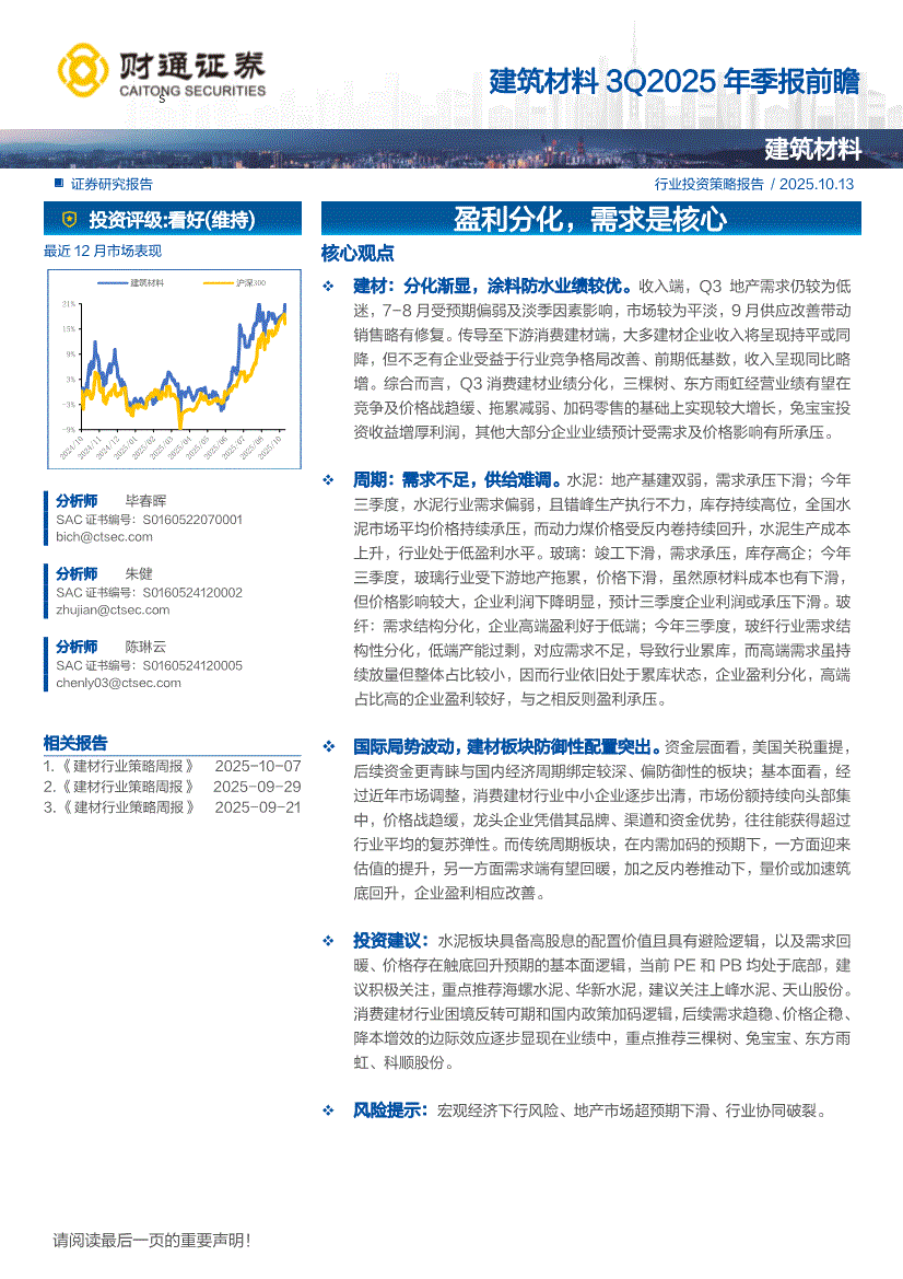 建筑材料行业:财通证券-建筑材料行业3Q2025年季报前瞻:盈利分化,需求是核心-251013