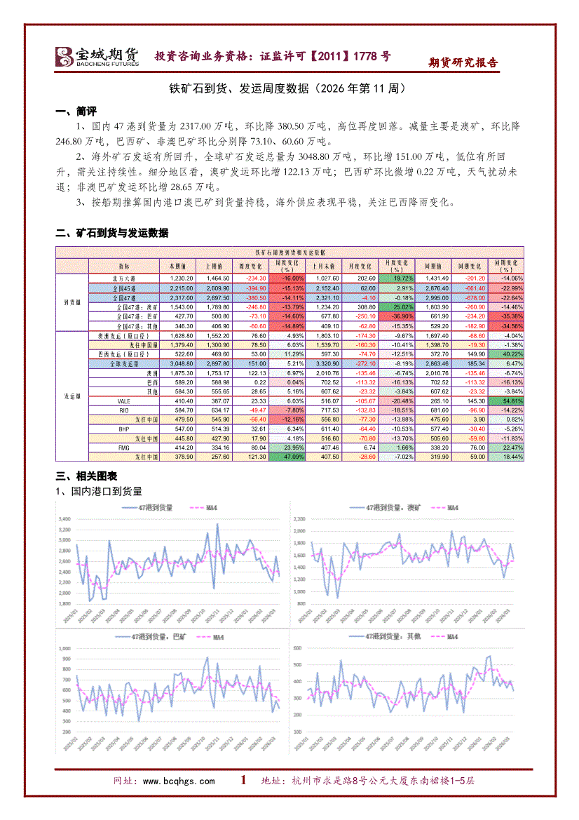 宝城期货-铁矿石到货、发运周度数据(2026年第11周)-260316