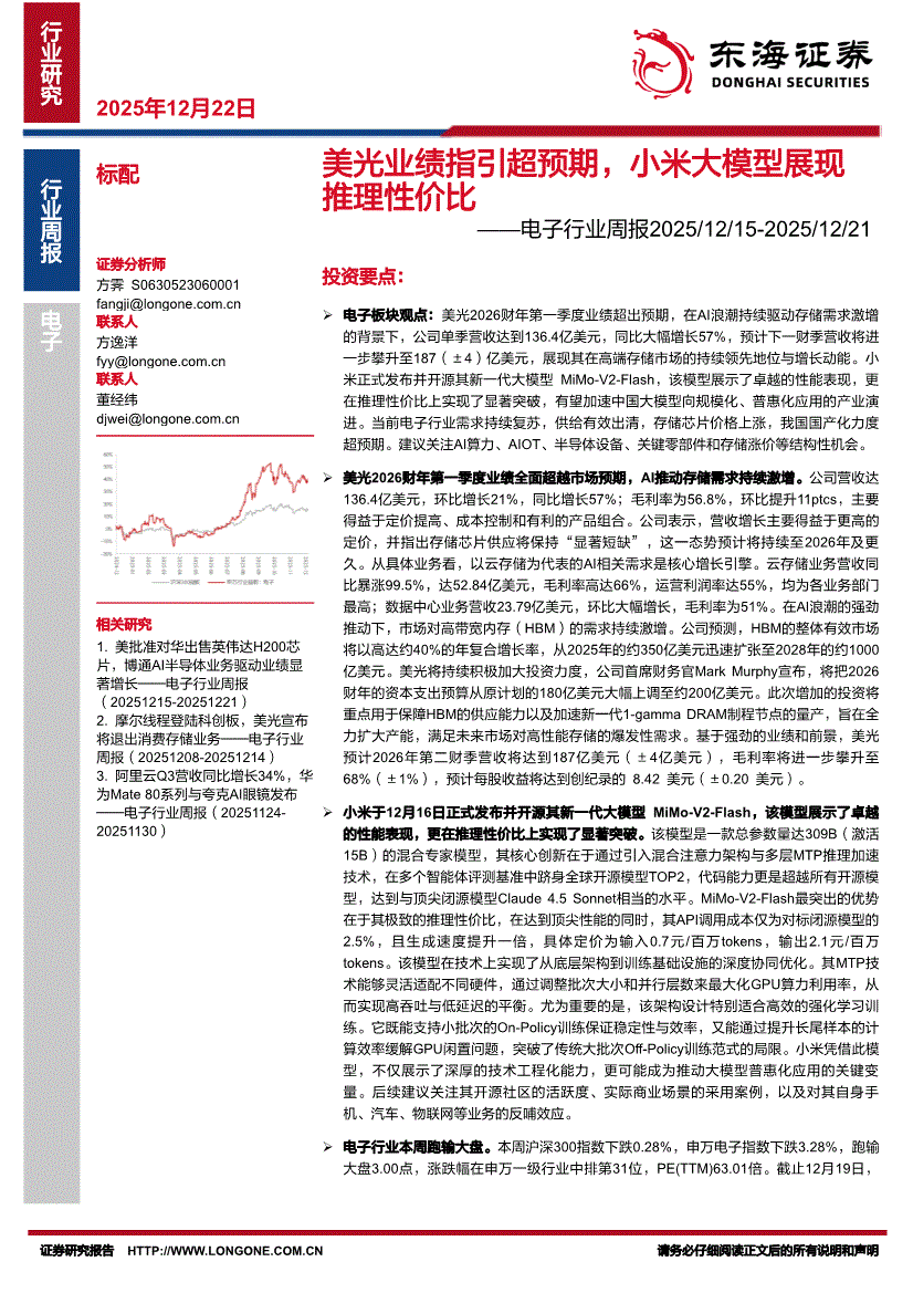 电子行业:东海证券-电子行业周报:美光业绩指引超预期,小米大模型展现推理性价比-251222