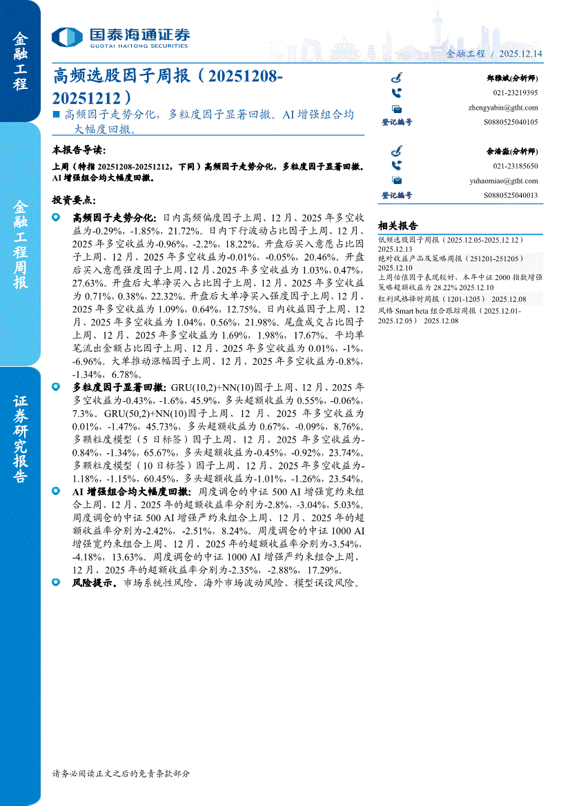 国泰海通证券-高频选股因子周报:高频因子走势分化,多粒度因子显著回撤。AI增强组合均大幅度回撤-251214