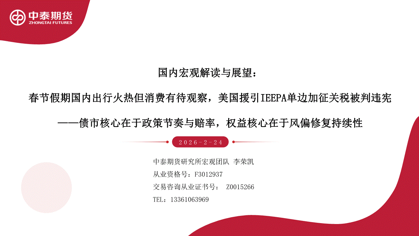 中泰期货-国内宏观解读与展望:春节假期国内出行火热但消费有待观察,美国援引IEEPA单边加征关税被判违宪——债市核心在于政策节奏与赔率,权益核心在于风偏修复持续性-260224