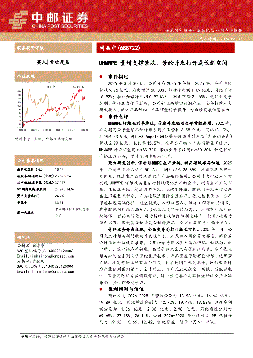 同益中:中邮证券-同益中-688722-UHMWPE量增支撑营收,芳纶并表打开成长新空间-260402