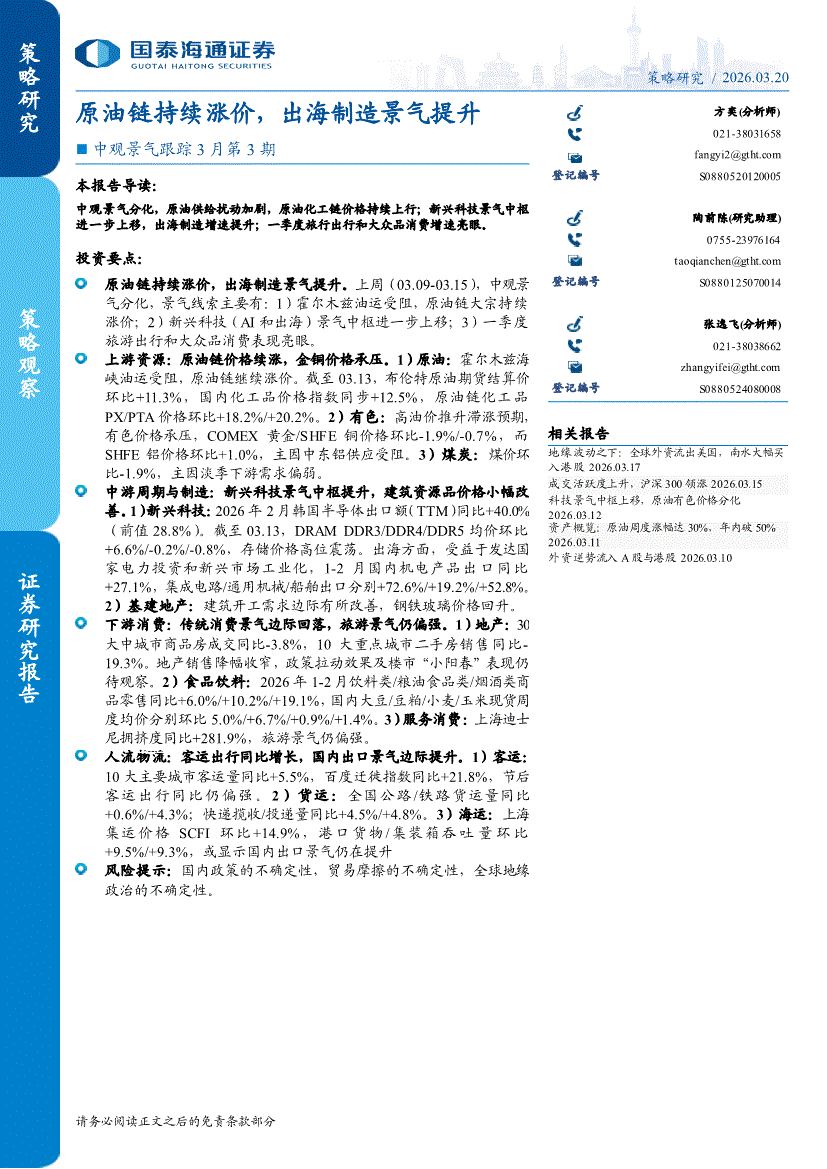 国泰海通证券-中观景气跟踪3月第3期:原油链持续涨价,出海制造景气提升-260320