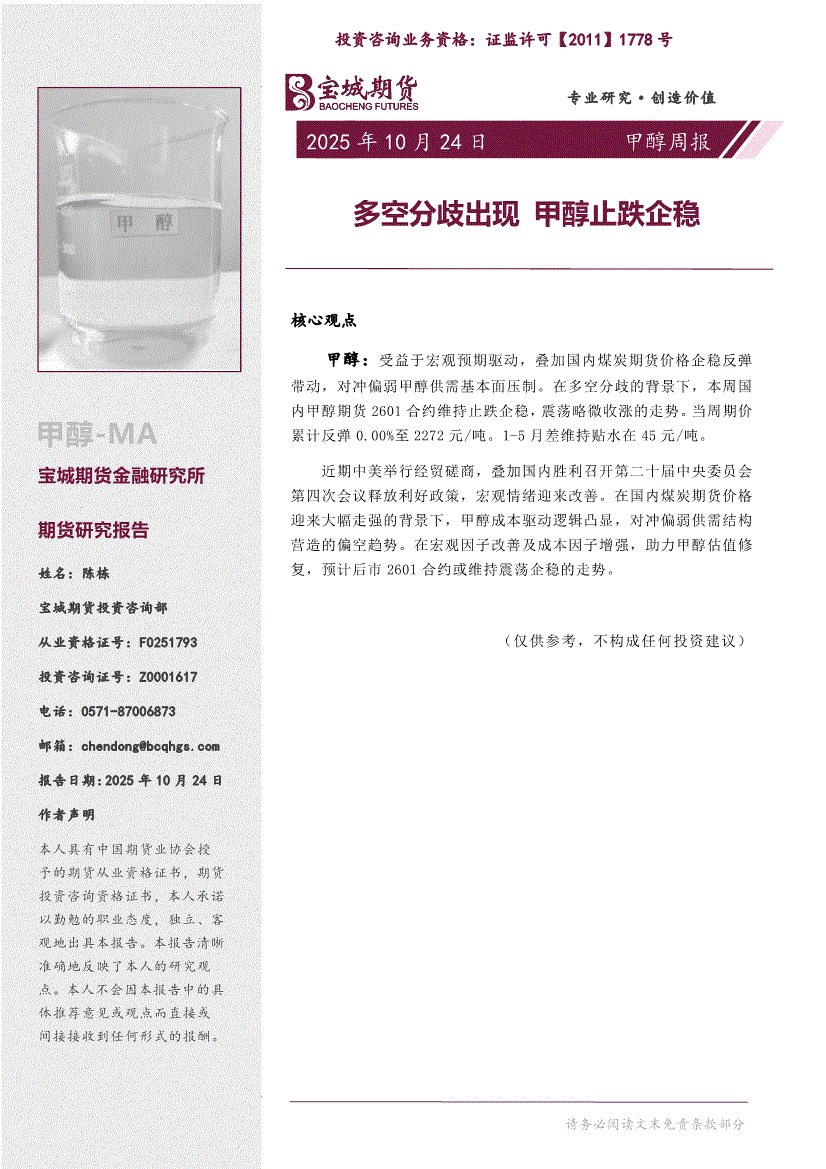 宝城期货-甲醇周报:多空分歧出现,甲醇止跌企稳-251024