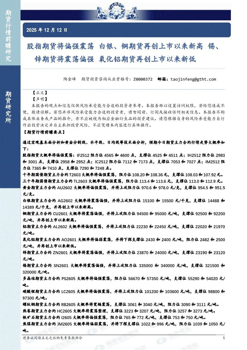 国泰君安期货-股指期货将偏强震荡,白银、铜期货再创上市以来新高,锡、锌期货将震荡偏强,氧化铝期货再创上市以来新低-251212