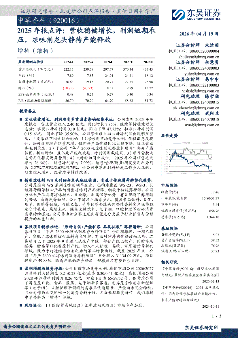 中草香料:东吴证券-中草香料-920016-2025年报点评:营收稳健增长,利润短期承压,凉味剂龙头静待产能释放-260419