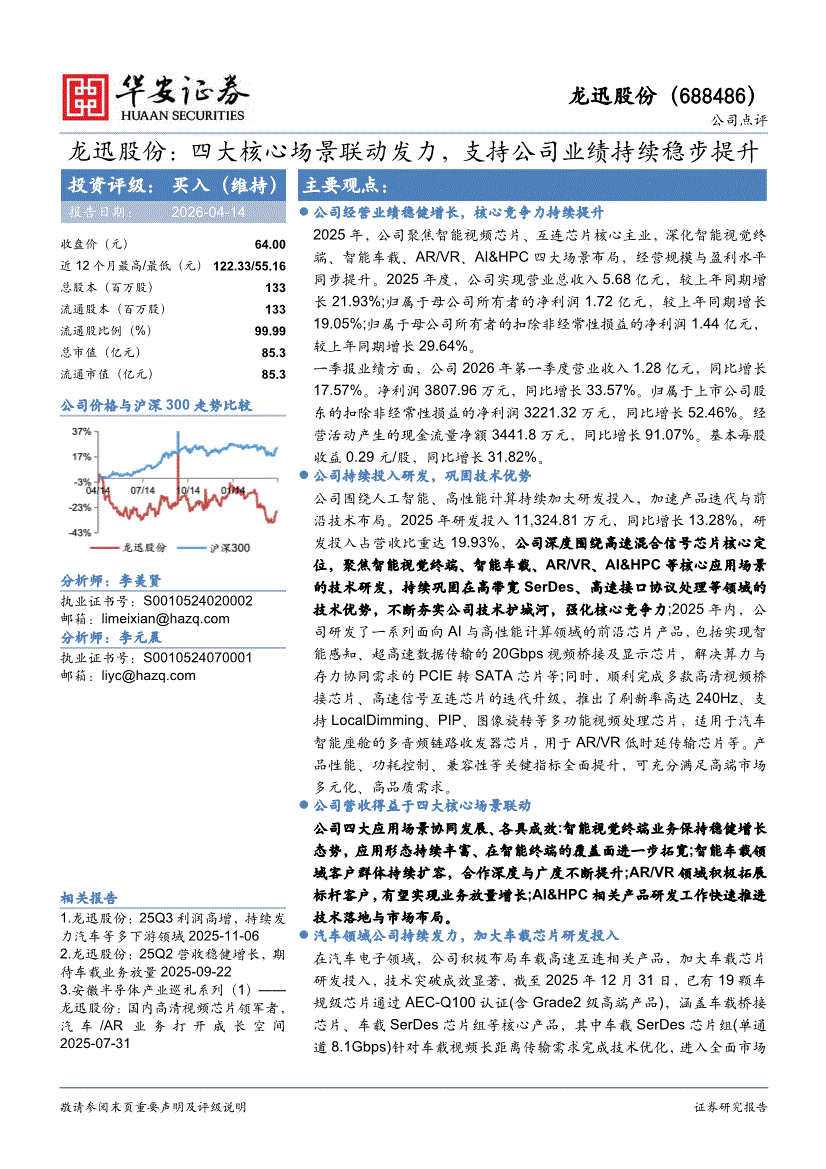 龙迅股份:华安证券-龙迅股份-688486-四大核心场景联动发力,支持公司业绩持续稳步提升-260414
