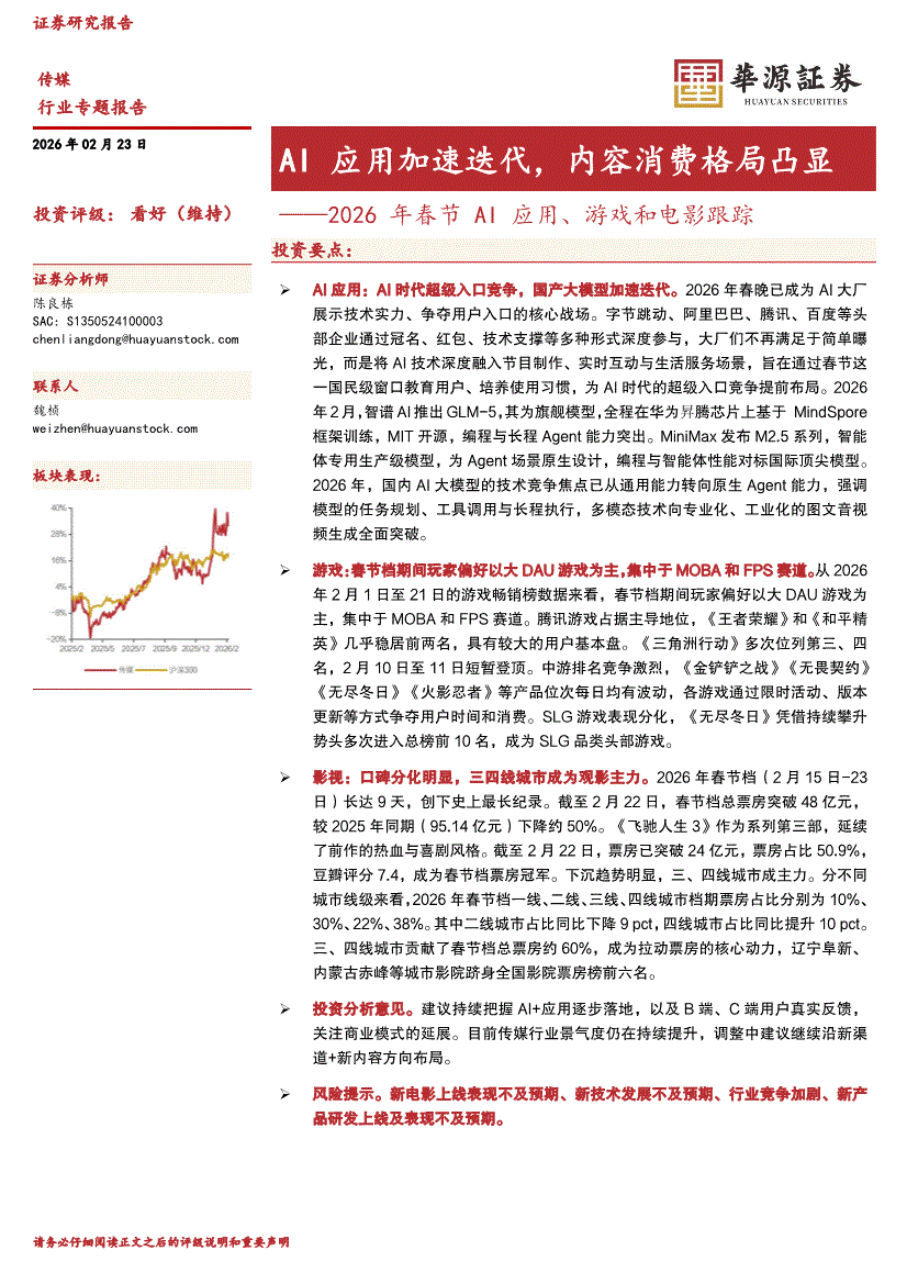 传媒行业:华源证券-传媒行业2026年春节AI应用、游戏和电影跟踪:AI应用加速迭代,内容消费格局凸显-260223