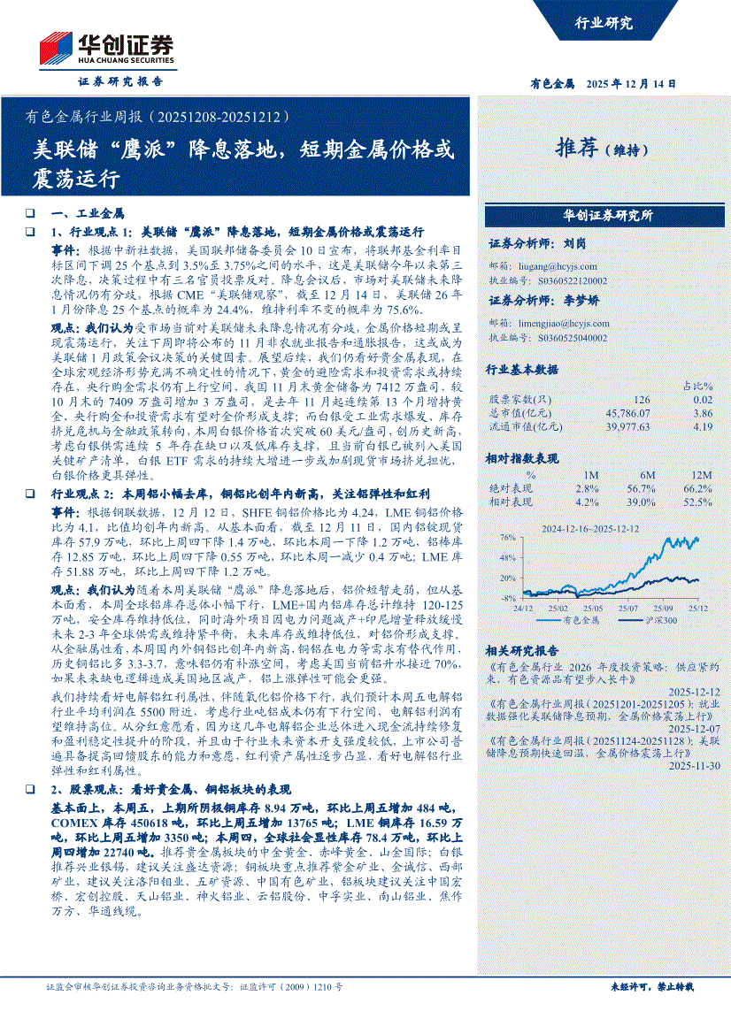 有色金属行业:华创证券-有色金属行业周报(20251208~20251212):美联储“鹰派”降息落地,短期金属价格或震荡运行-251214