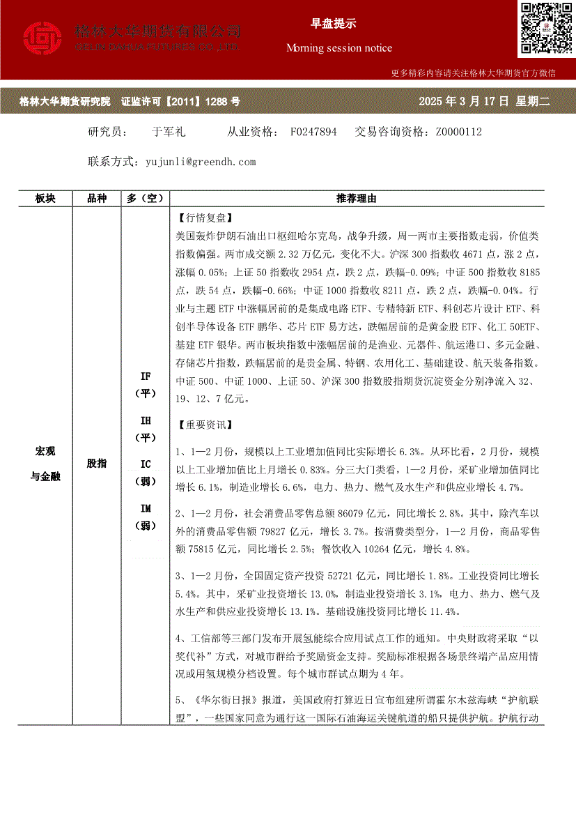 格林大华期货-早盘提示:股指-260317