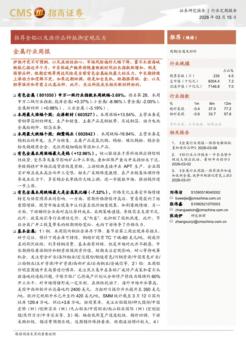 金属行业:招商证券-金属行业周报:推荐金铝以及涨价品种抵御宏观压力-260315