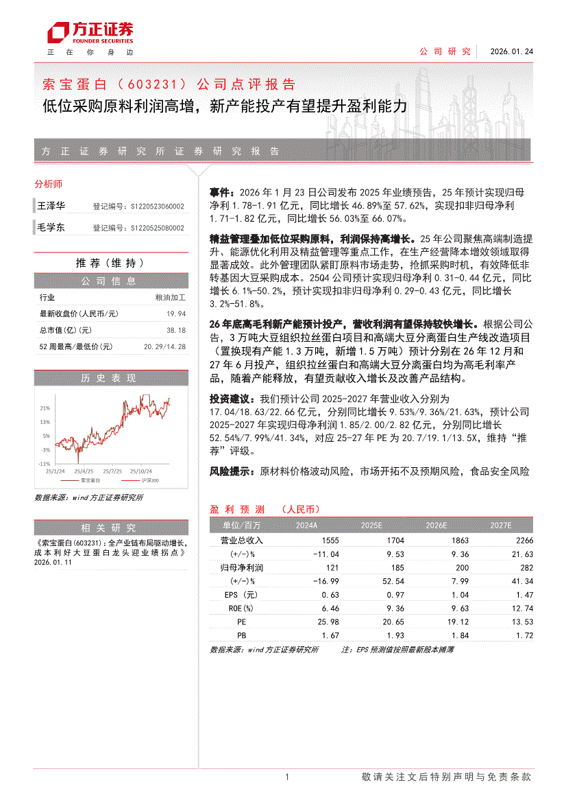 索宝蛋白:方正证券-索宝蛋白-603231-公司点评报告:低位采购原料利润高增,新产能投产有望提升盈利能力-260124