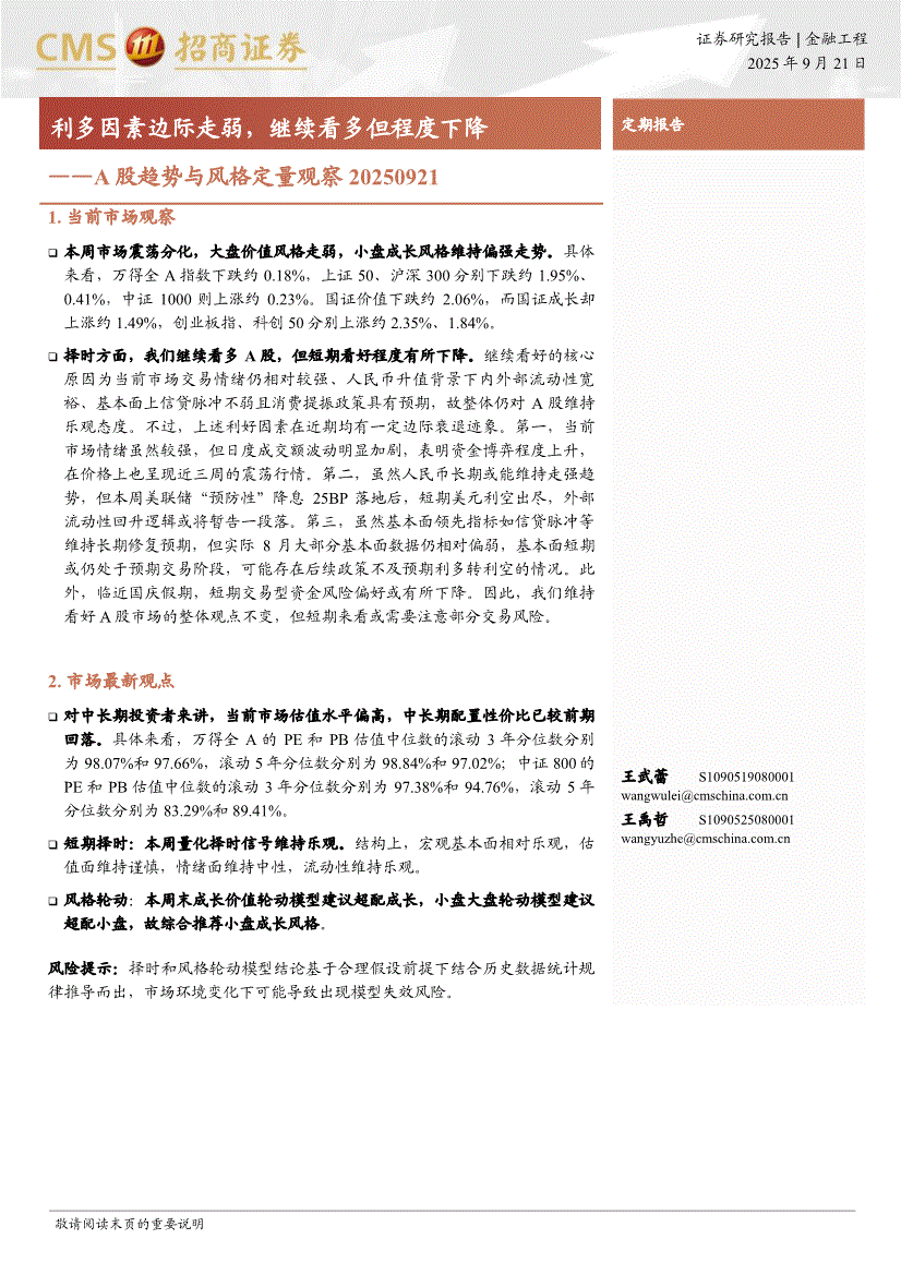 招商证券-A股趋势与风格定量观察:利多因素边际走弱,继续看多但程度下降-250921