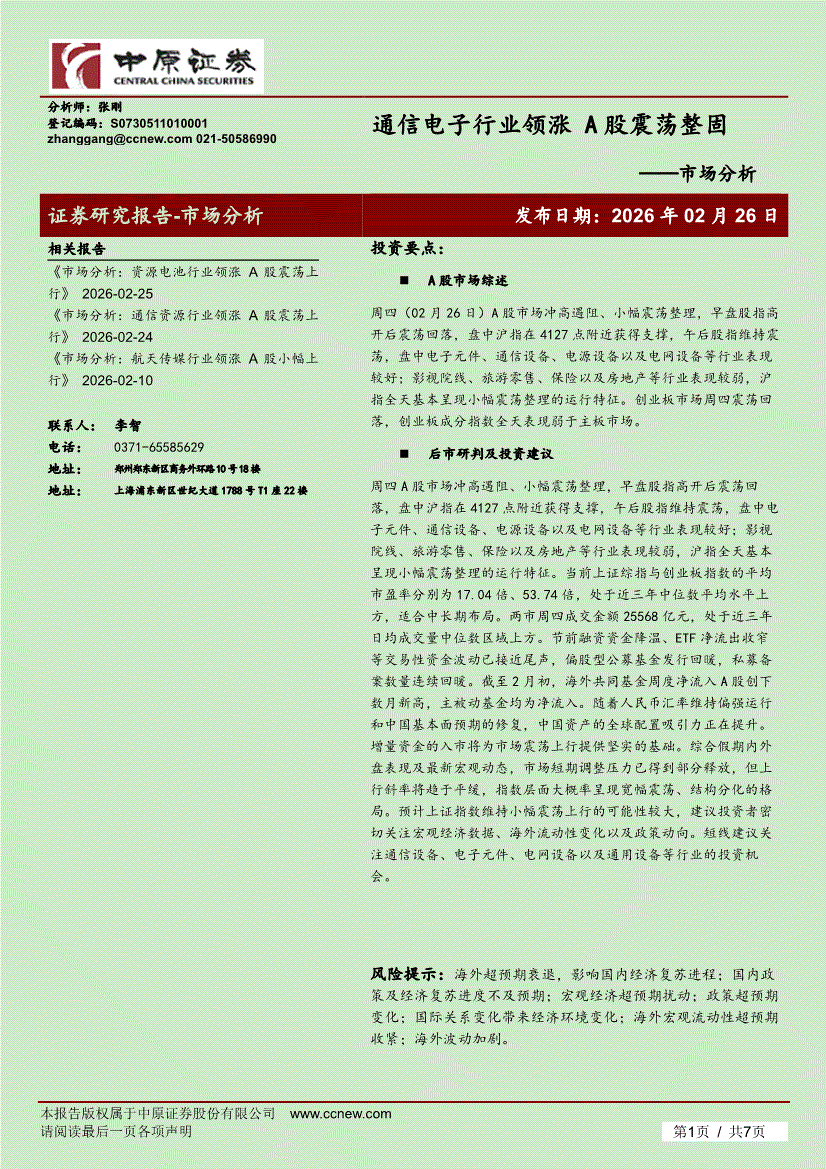 中原证券-市场分析:通信电子行业领涨,A股震荡整固-260226
