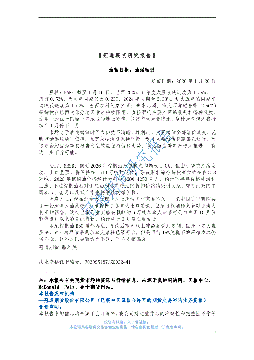 冠通期货-油粕日报:油强粕弱-260120