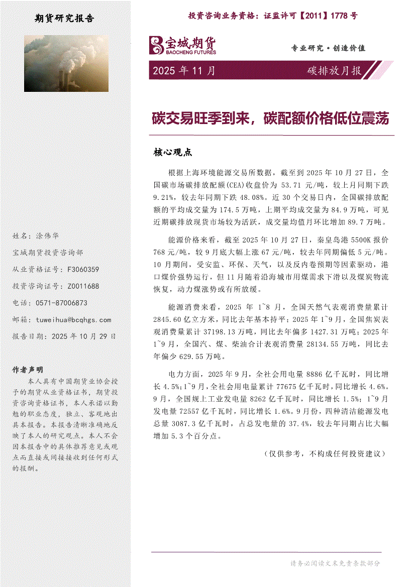 宝城期货-碳排放月报:碳交易旺季到来,碳配额价格低位震荡-251029