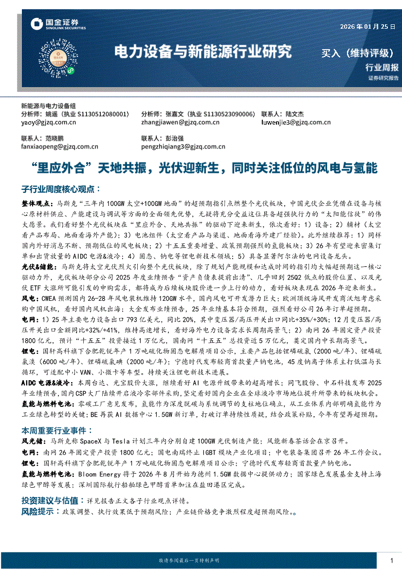 电力设备与新能源行业:国金证券-电力设备与新能源行业周报:“里应外合”天地共振,光伏迎新生,同时关注低位的风电与氢能-260125