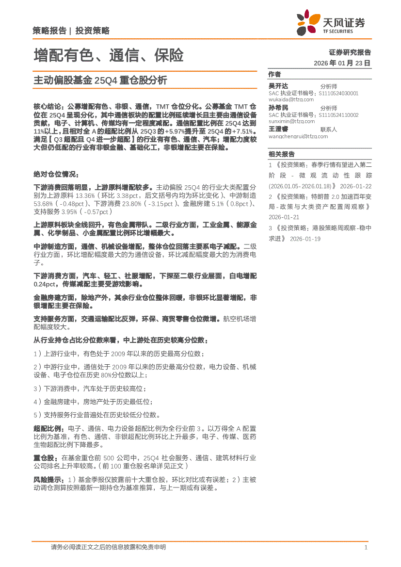 天风证券-主动偏股基金25Q4重仓股分析:增配有色、通信、保险-260123