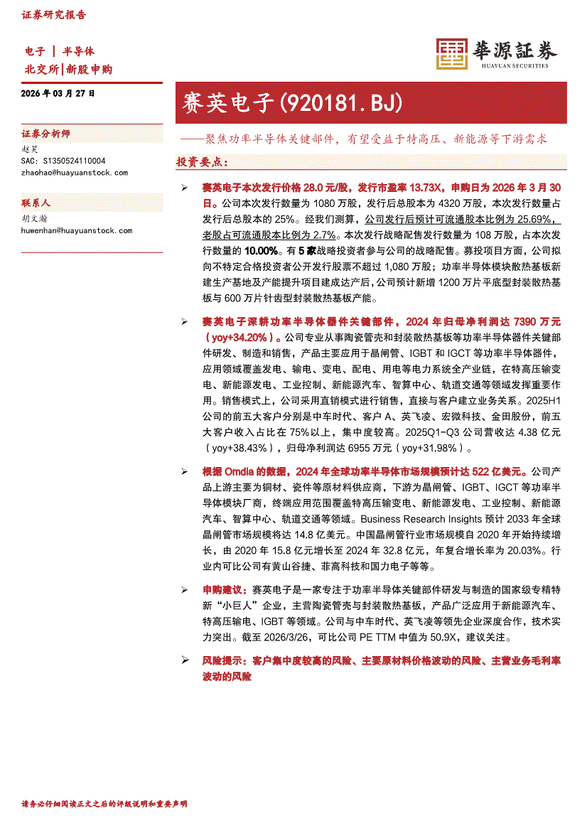赛英电子:华源证券-赛英电子-920181-聚焦功率半导体关键部件,有望受益于特高压、新能源等下游需求-260327