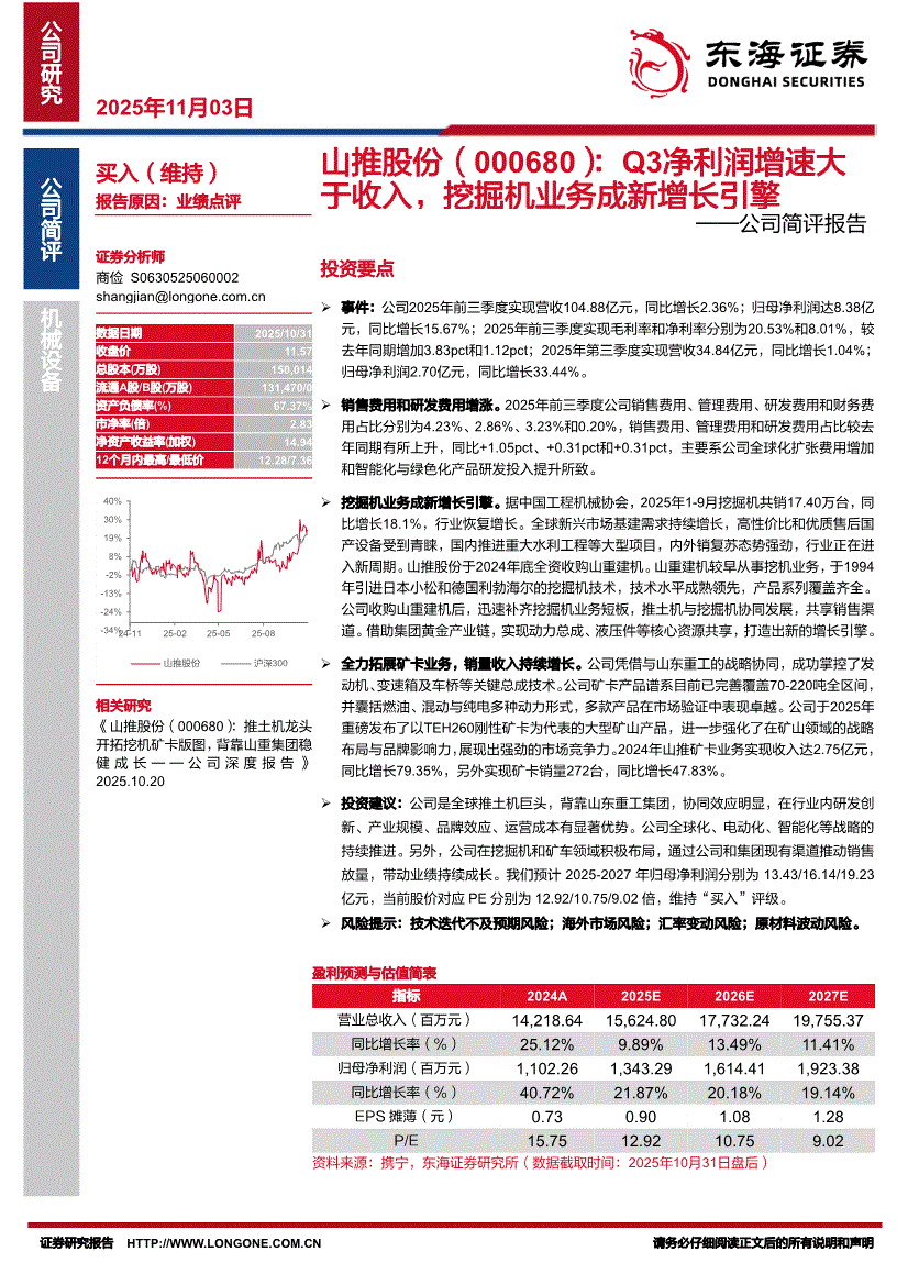 山推股份:东海证券-山推股份-000680-公司简评报告:Q3净利润增速大于收入,挖掘机业务成新增长引擎-251103
