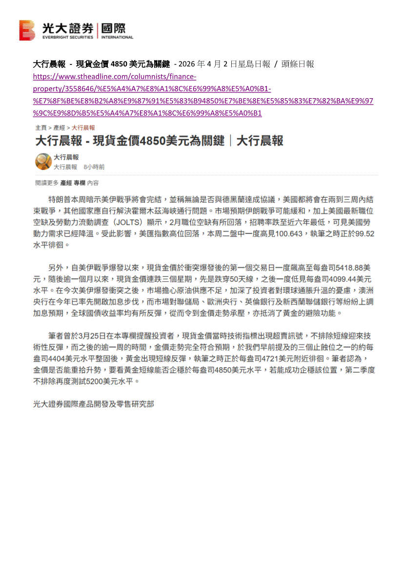 光大证券(国际)-大行晨报:现货金价4850美元为关键-260402