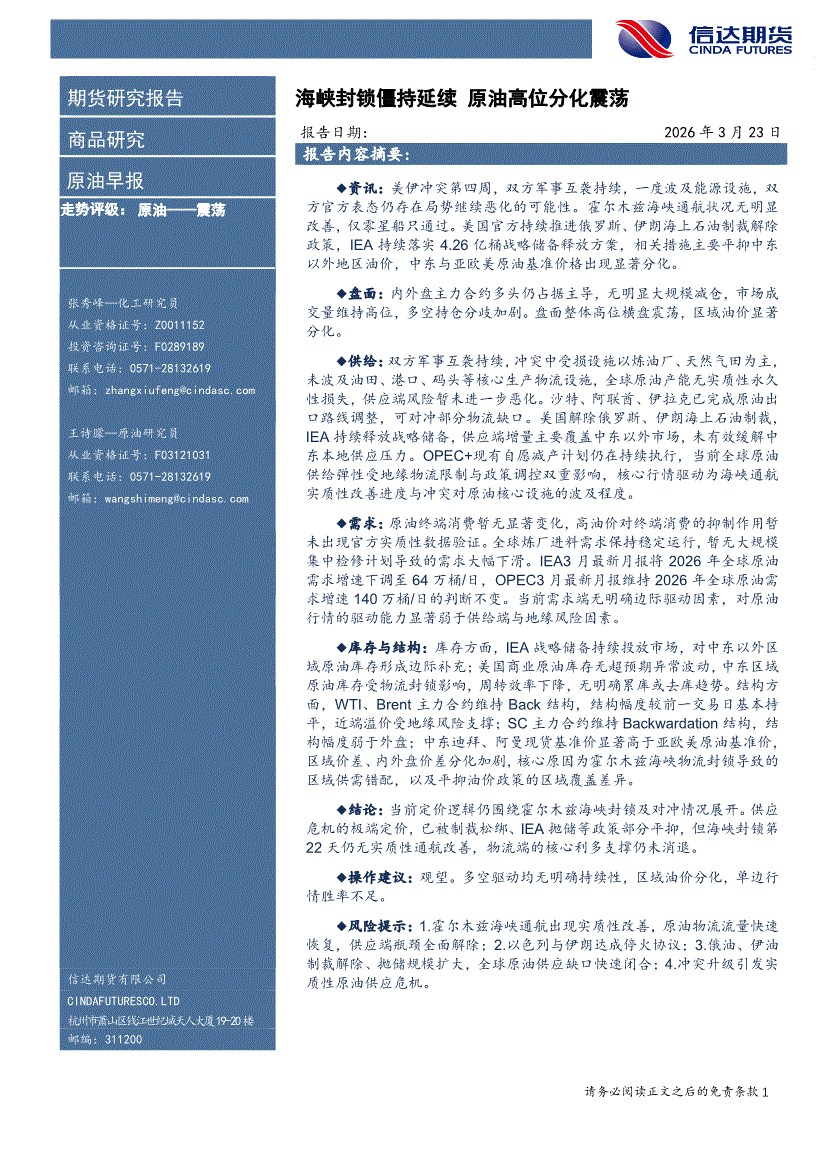 信达期货-原油早报:海峡封锁僵持延续,原油高位分化震荡-260323