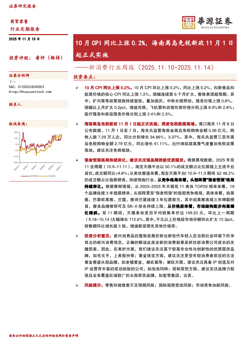 新消费行业:华源证券-新消费行业周报:10月CPI同比上涨0.2%,海南离岛免税新政11月1日起正式实施-251115