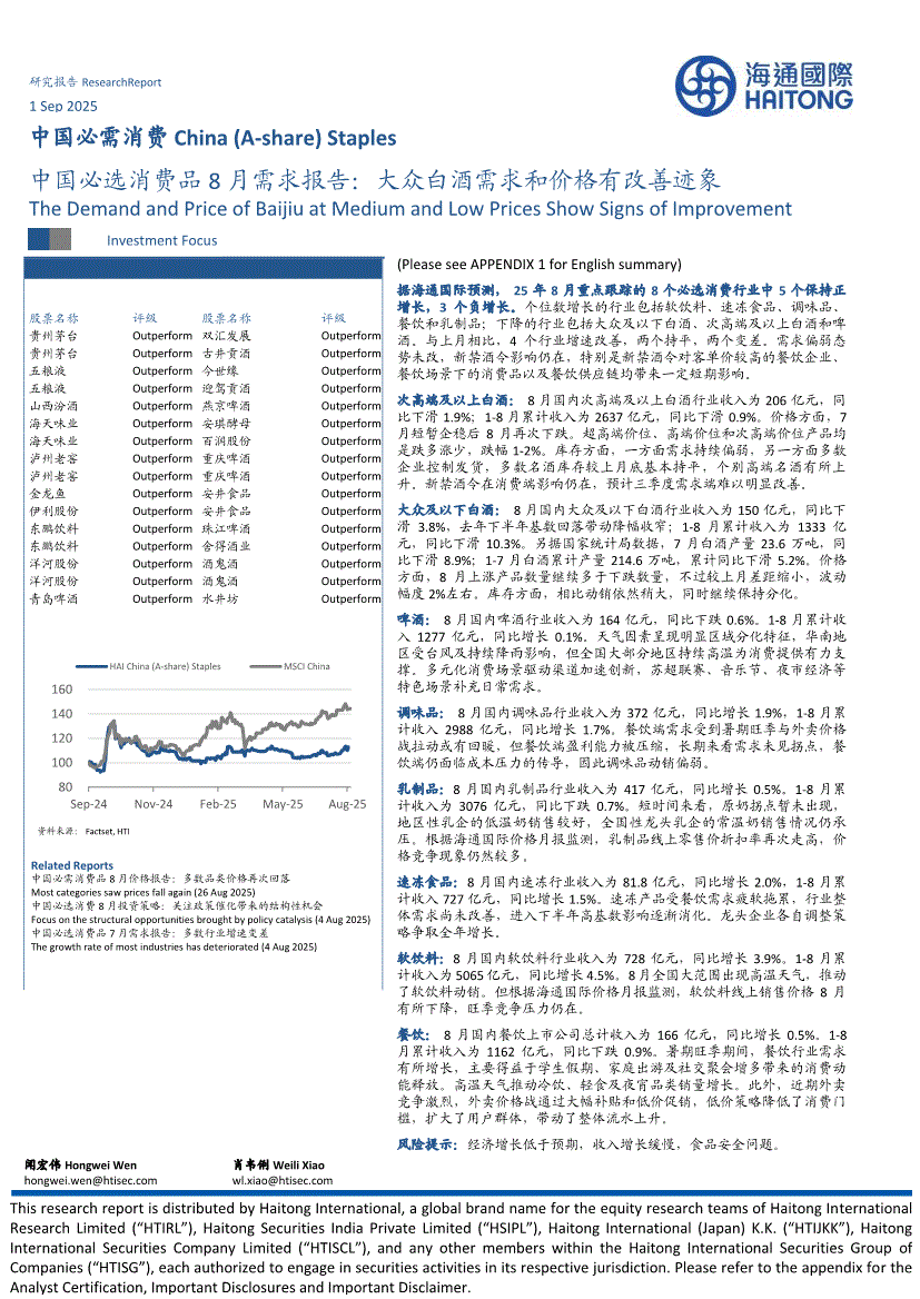 消费品行业:海通国际-中国必选消费品行业8月需求报告:大众白酒需求和价格有改善迹象-250901