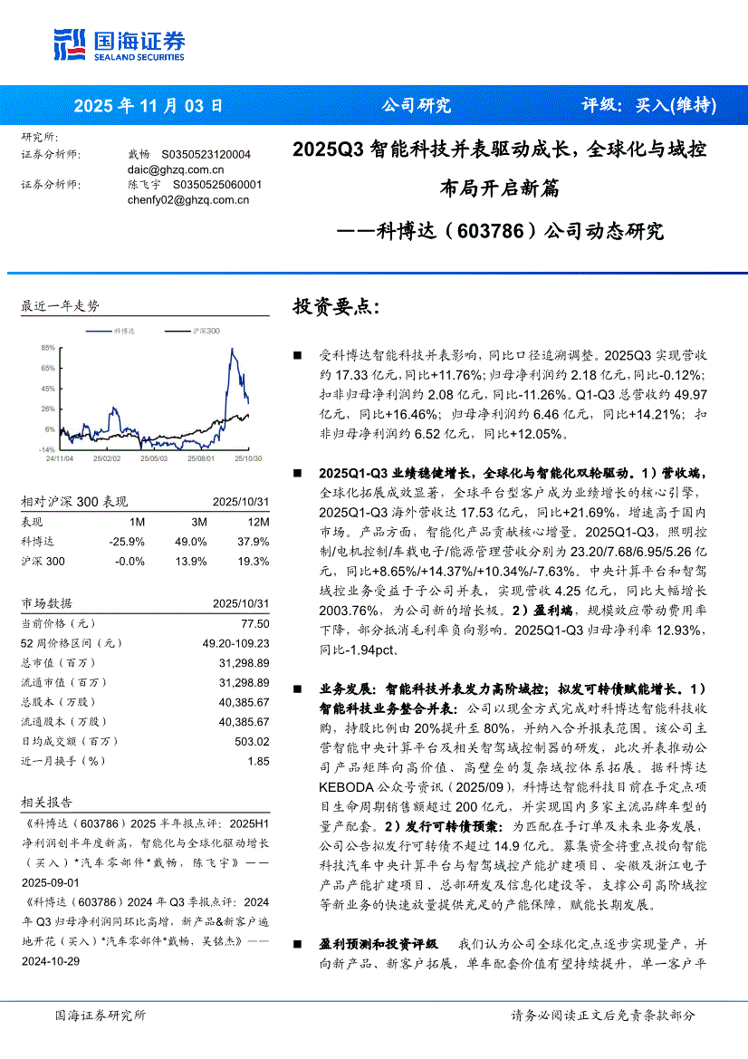 科博达:国海证券-科博达-603786-公司动态研究:2025Q3智能科技并表驱动成长,全球化与域控布局开启新篇-251103