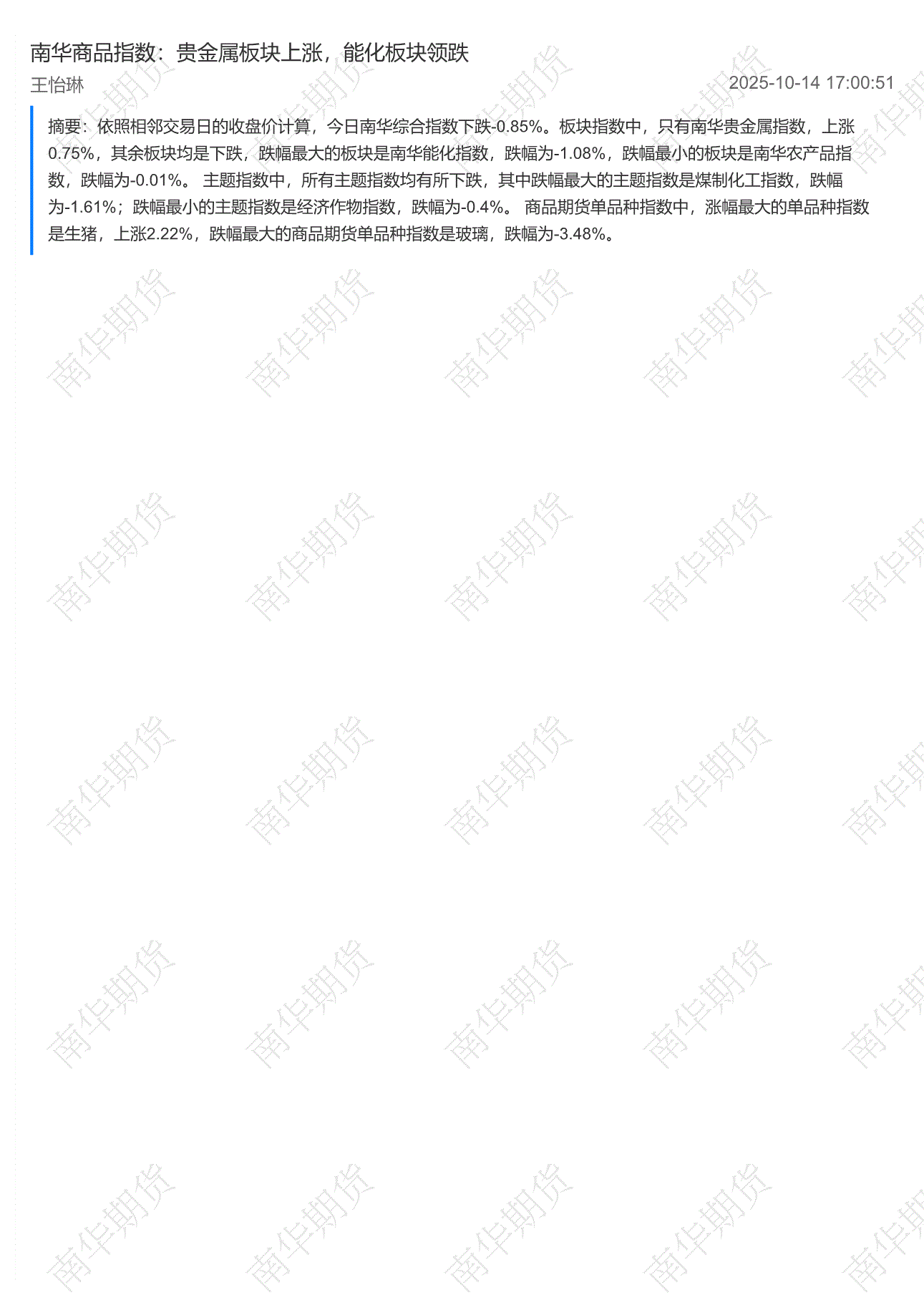 南华期货-南华商品指数:贵金属板块上涨,能化板块领跌-251014