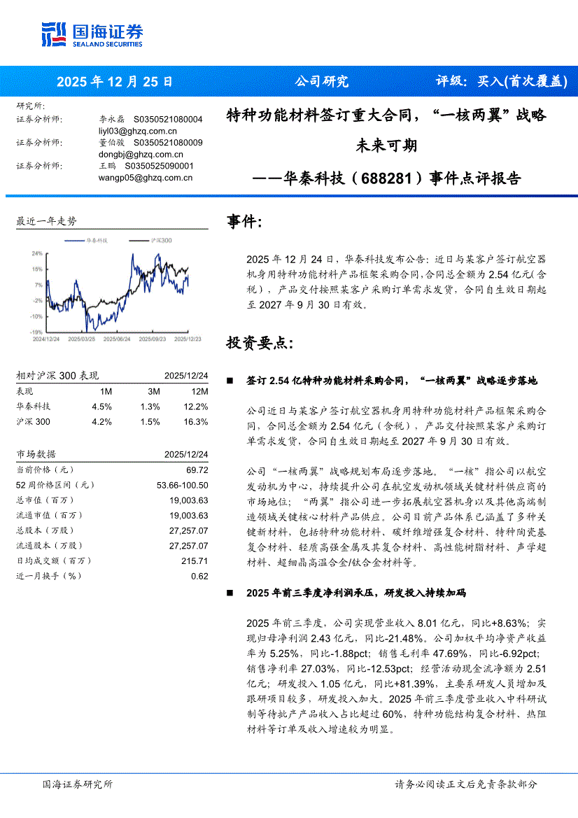 华秦科技:国海证券-华秦科技-688281-事件点评报告:特种功能材料签订重大合同,“一核两翼”战略未来可期-251225
