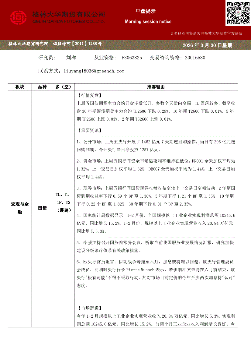 格林大华期货-国债早盘提示-260330