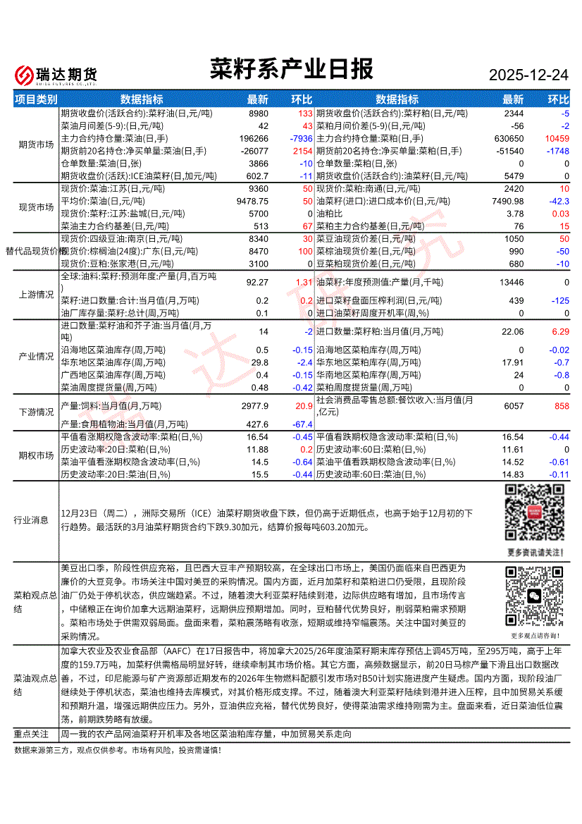 瑞达期货-菜籽类市场周报:国际菜籽下跌拖累,菜系品种同步走弱-251219