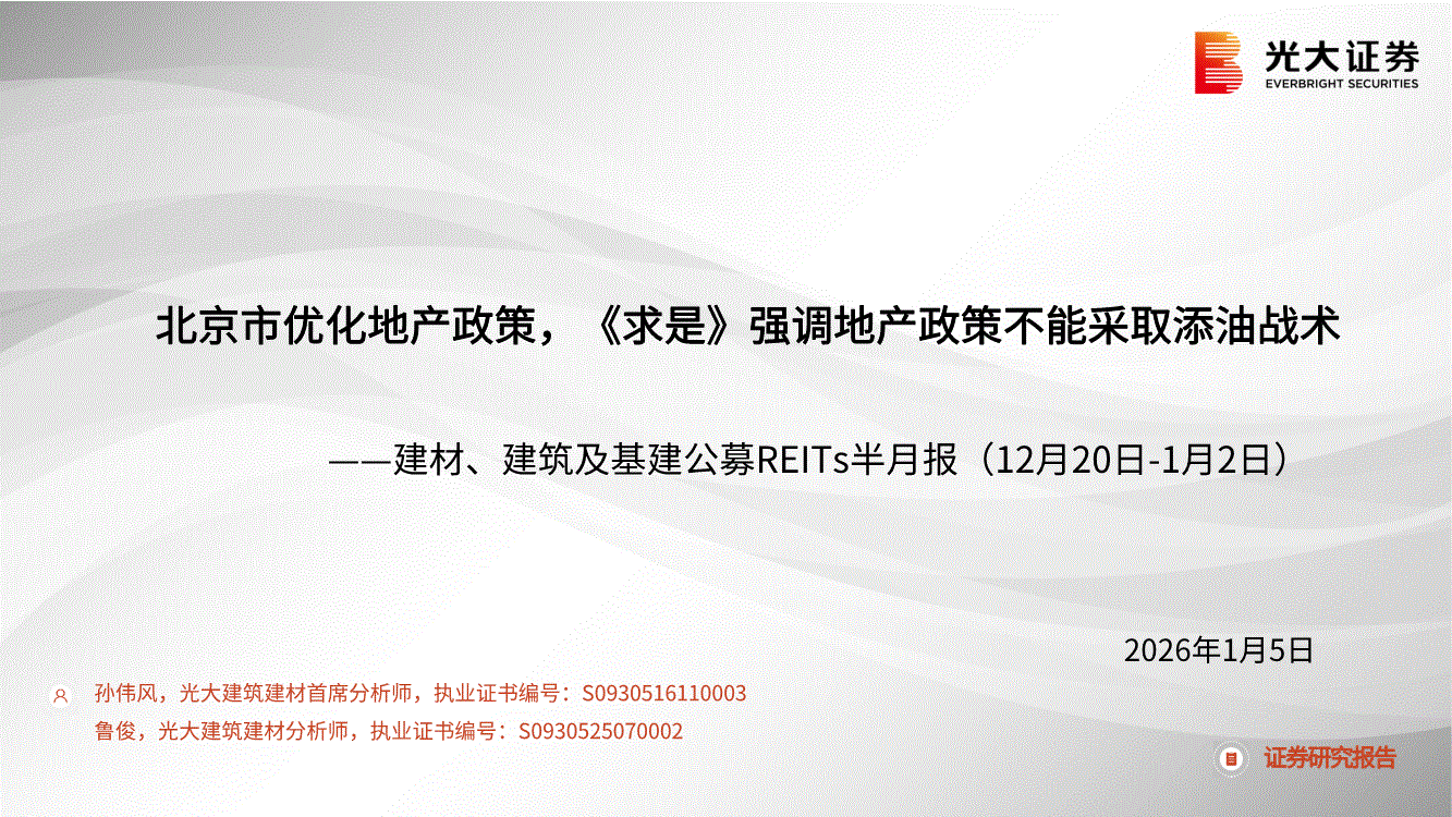 建材、建筑及基建行业:光大证券-建材、建筑及基建行业公募REITs半月报(12月20日~1月2日):北京市优化地产政策,《求是》强调地产政策不能采取添油战术-260105