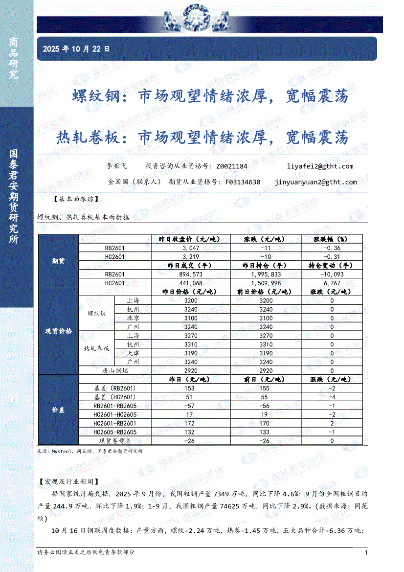 国泰君安期货-螺纹钢:市场观望情绪浓厚,宽幅震荡,热轧卷板,市场观望情绪浓厚,宽幅震荡-251022