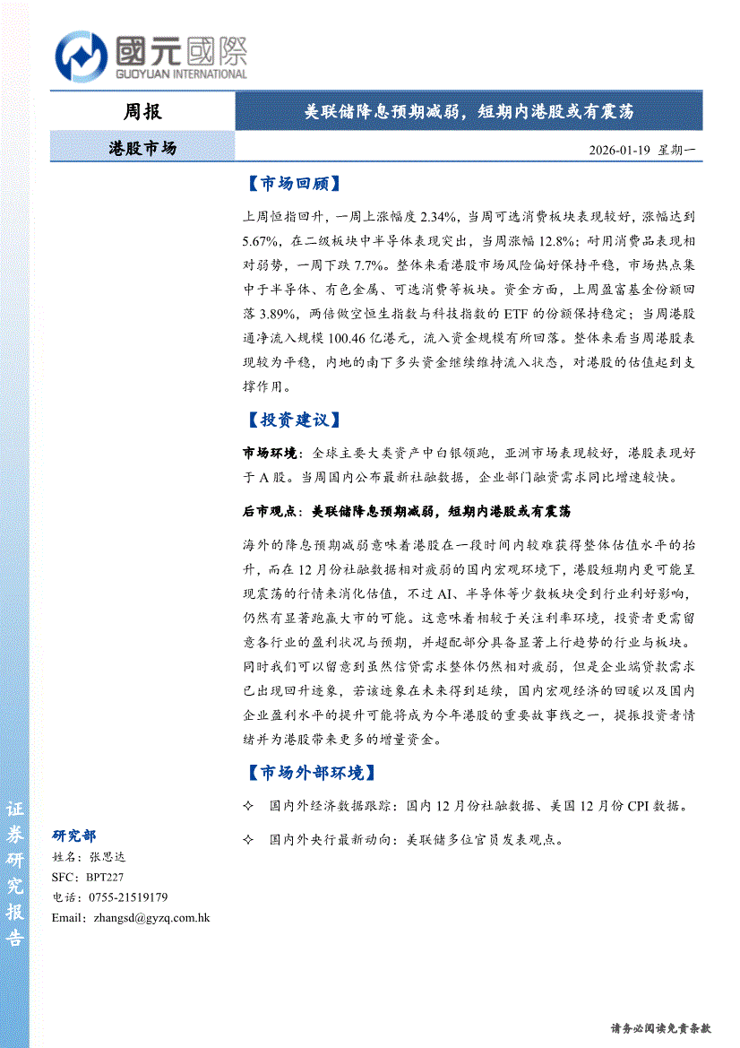 国元国际-港股市场周报:美联储降息预期减弱,短期内港股或有震荡-260119