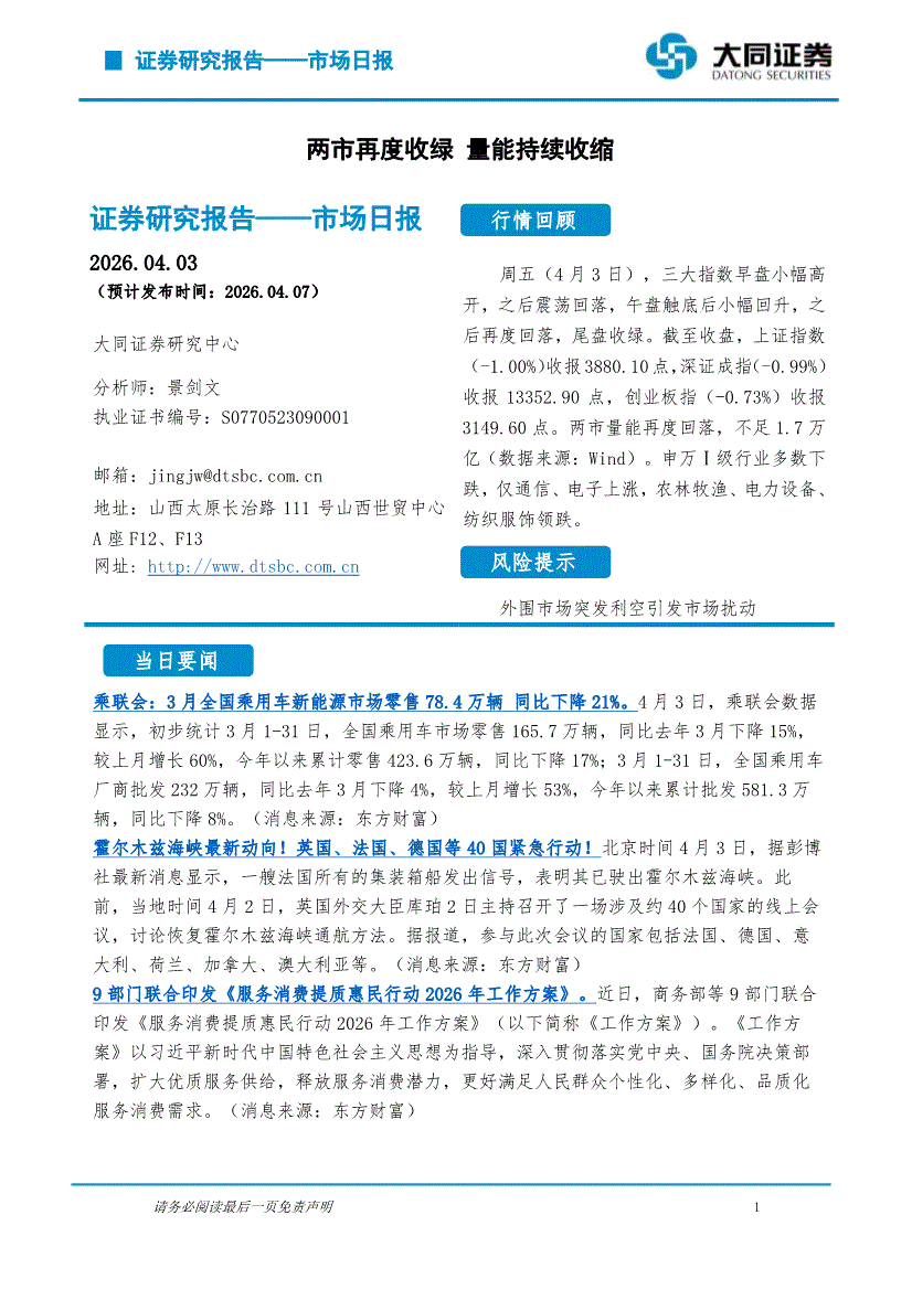 大同证券-市场日报:两市再度收绿,量能持续收缩-260403