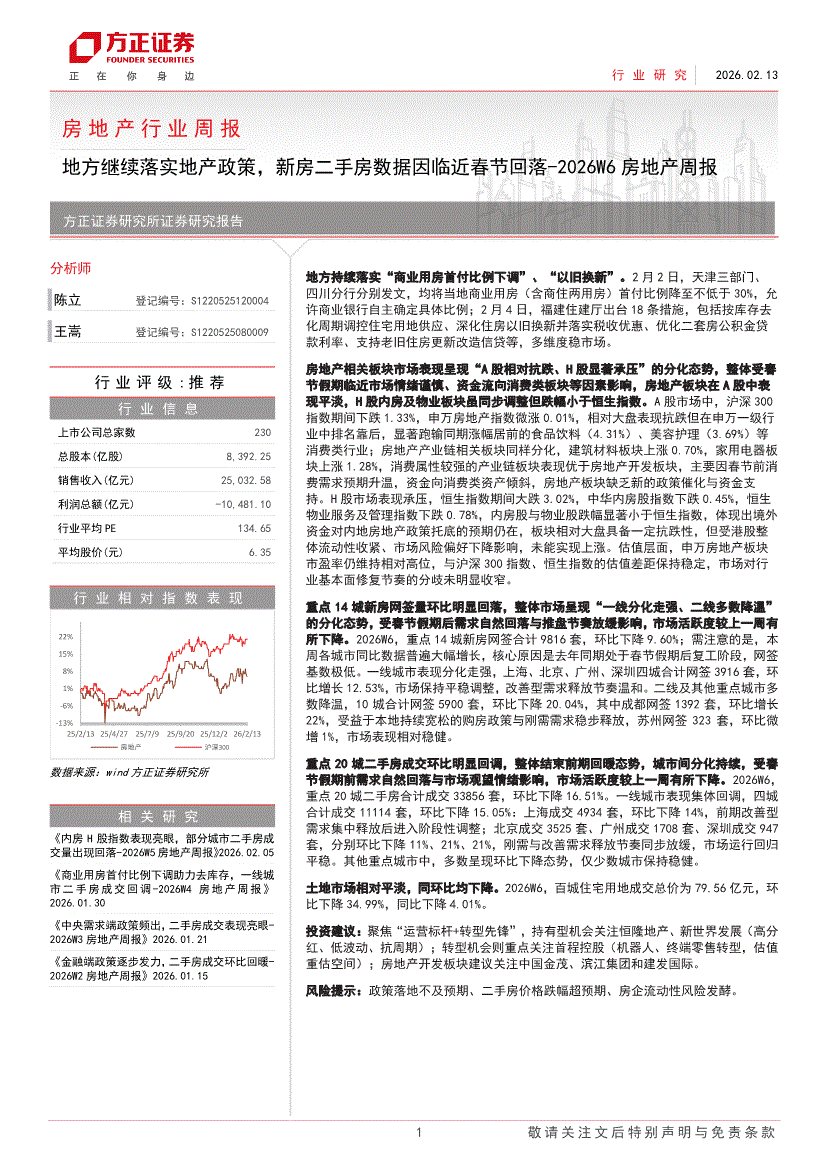 房地产行业:方正证券-房地产行业周报:地方继续落实地产政策,新房二手房数据因临近春节回落~2026W6房地产周报-260213