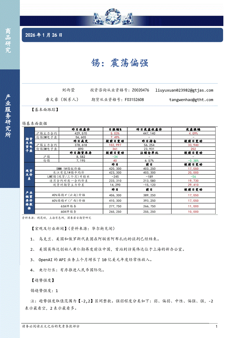 国泰君安期货-锡:震荡偏强-260126
