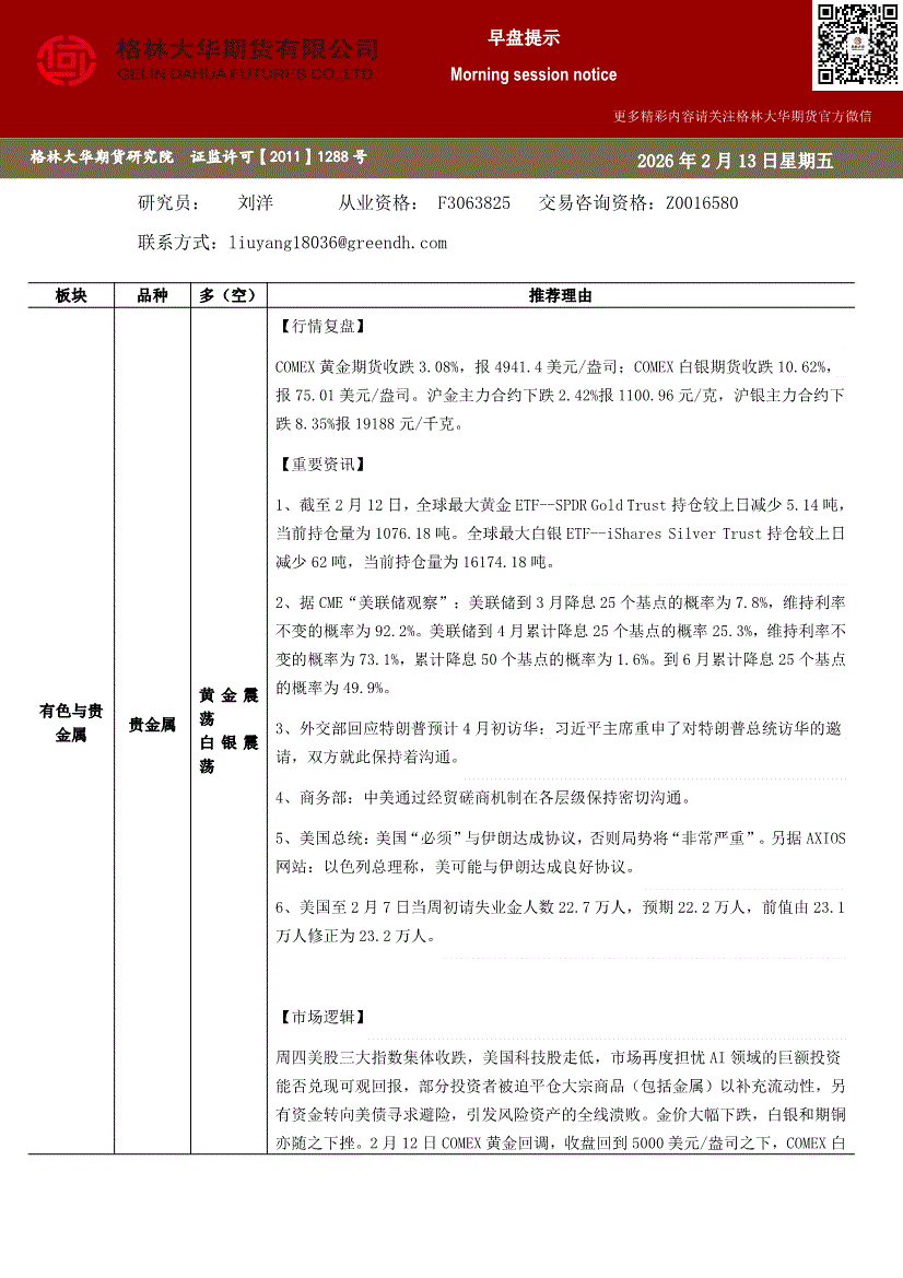 格林大华期货-对国内期货市场一周行情回顾-260213